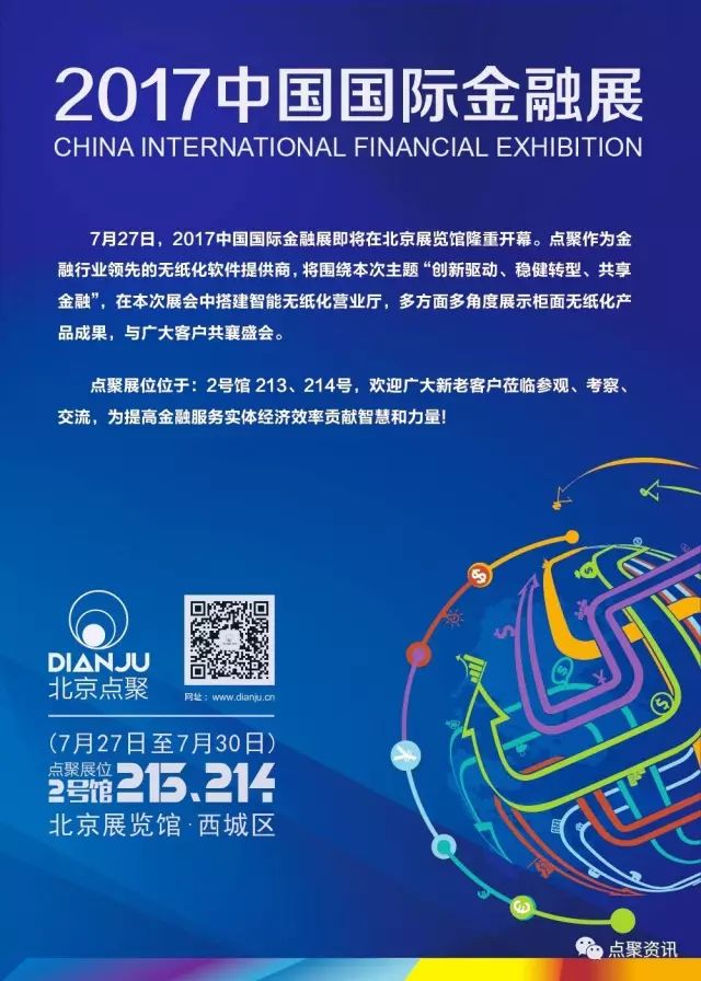 7月27日,2017中国国际金融展即将在北京展览馆隆重开幕。点聚作为金融行业较领先的无纸化软件提供商,将围绕本次主题“创新驱动 稳健转型 共享金融”,在本次展会中搭建智能无纸化营业厅,多方面多角度展示柜面无纸化产品成果,与广大客户共襄盛会。
