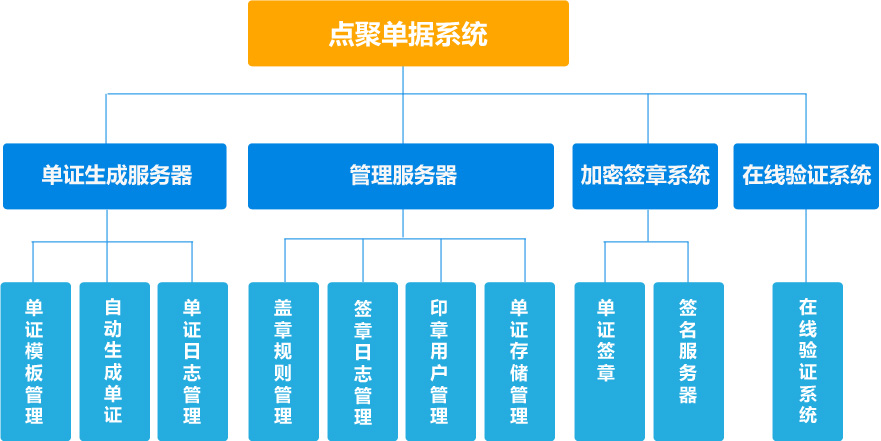 电子单据系统细分为单据生成服务器系统、管理服务器系统、加密签章服务器系统、在线验证系统四部分组成。