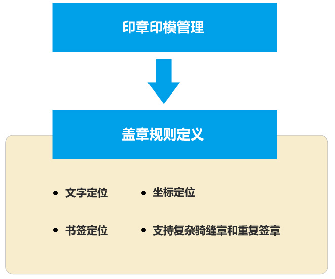根据业务需求配置盖章规则,提供业务系统盖章使用,支持绝对坐标、文字、骑缝章等方式。