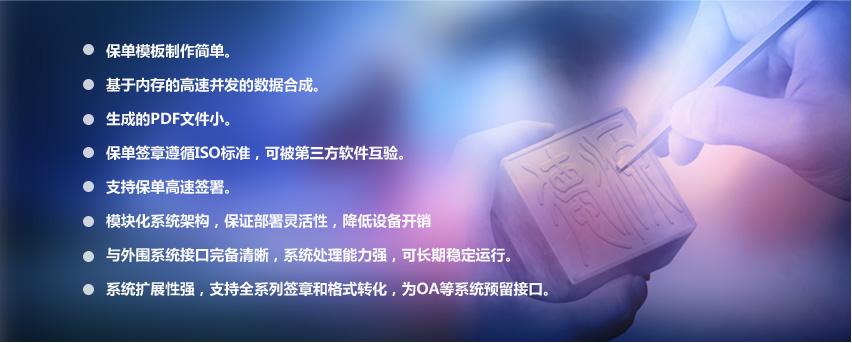 主要功能包含:电子单据的生成与管理,电子印章制作与管理,对电子单据进行批量签章或手工签章,数字证书服务,防伪验证服务。