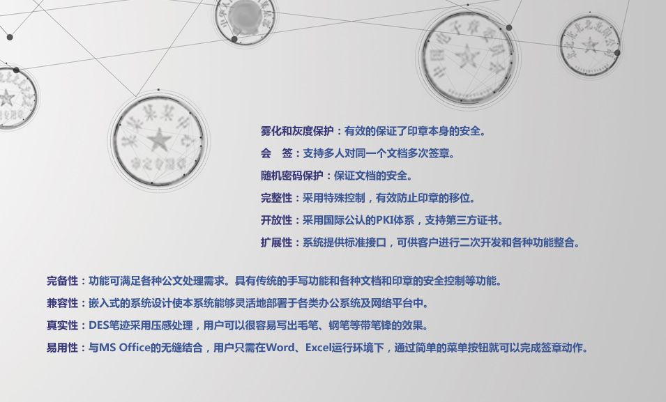 OFFICE签章产品名称为:DES电子签章系统。 系统采用了中间件技术, 基于国际公认的公钥基础设施PKI体系,产品设计及开发流 程均符合国际标准。通过采用最著名的非对称加密算法RSA算法对印章进行数字签名,能保证电子印章的可鉴别性,防止对签章的否认与 抵赖;同时利用数字指纹技术能精确地发现攻击者对电子文档的非法篡改,保障电子公文的真实性和完整性。