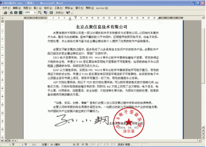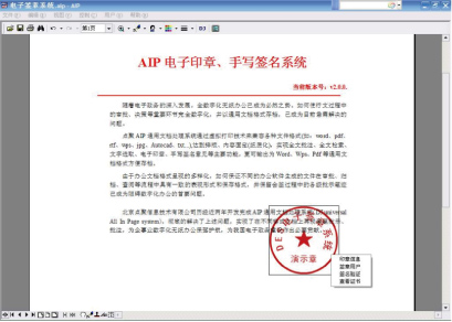支持任何可打印文档转化为PDF。盖章文档支持使用A-reader直接阅读,可以查看数字证书和校验文档完整性。支持各类骑缝章。 采用国际公认的PKI体系,支持第三方证书,功能强大,可满足各种公文处理需求。具有传统的手写功能和各种文档和印章的安全控制等 功能。系统提供标准接口,可供客户进行二次开发和各种功能整合。笔迹采用压感处理,用户可以很容易写出毛笔、钢笔等带笔锋的效果。