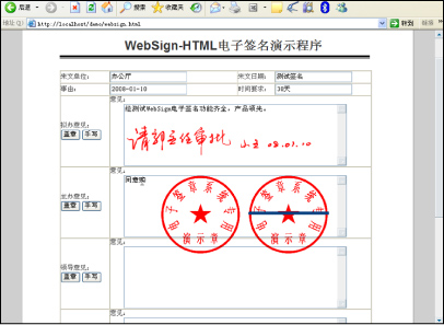 HTML签章产品名称为:WEBSIGN。专用于对网页(表单)信息进行电子签章和手写审批,支持Html、ASP、JSP和PHP等网页,能够绑定网页中的数据敏感区域,该区域由 用户来指定,可以是整个页面。签章后一旦所绑定区域的信息发生改变,系统就能立即校验出来。印章一旦锁定位置,无论屏幕分辨率如 何变化,都不会使印章相对其所加盖的信息发生移动。市场上其它网页印章系统对网页位置依赖性很强,如果网页不是居中的,当屏幕分 辨率发生变化时,印章就会相对其所加盖的信息发生位置移动。Web-Sign设计严密,对技术细节处理得相当不错,尽可能的阻止了安全漏 洞的产生。能够非常方便的嵌入到各类架构的办公系统中,减少开发和维护量。