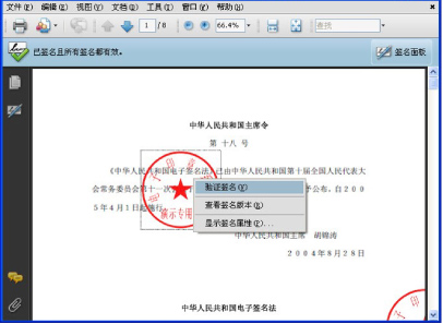 PDF签章产品名称为:TRUSTEDPDF。PDF版式签章是在AIP版式的基础上,按照Adobe签名标准实现的PDF文件签章。与AIP版式不同的事保存的文档格式为PDF文件, 直接使用Adobe reader实现对pdf文件的浏览,文档完整性的验证和数字证书的查看。